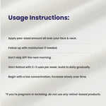 When applying Retinol, apply a pea-sized amount on the entire face carefully, avoiding sensitive areas like the eyes, nose and mouth.